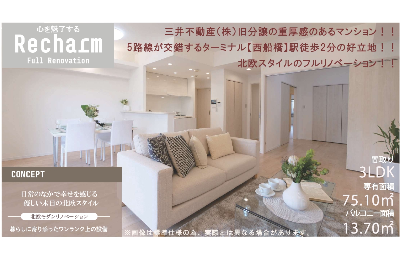 西船橋駅2分×三井旧分譲!8階角住戸、北欧モダンにフルリノベされた上質空間