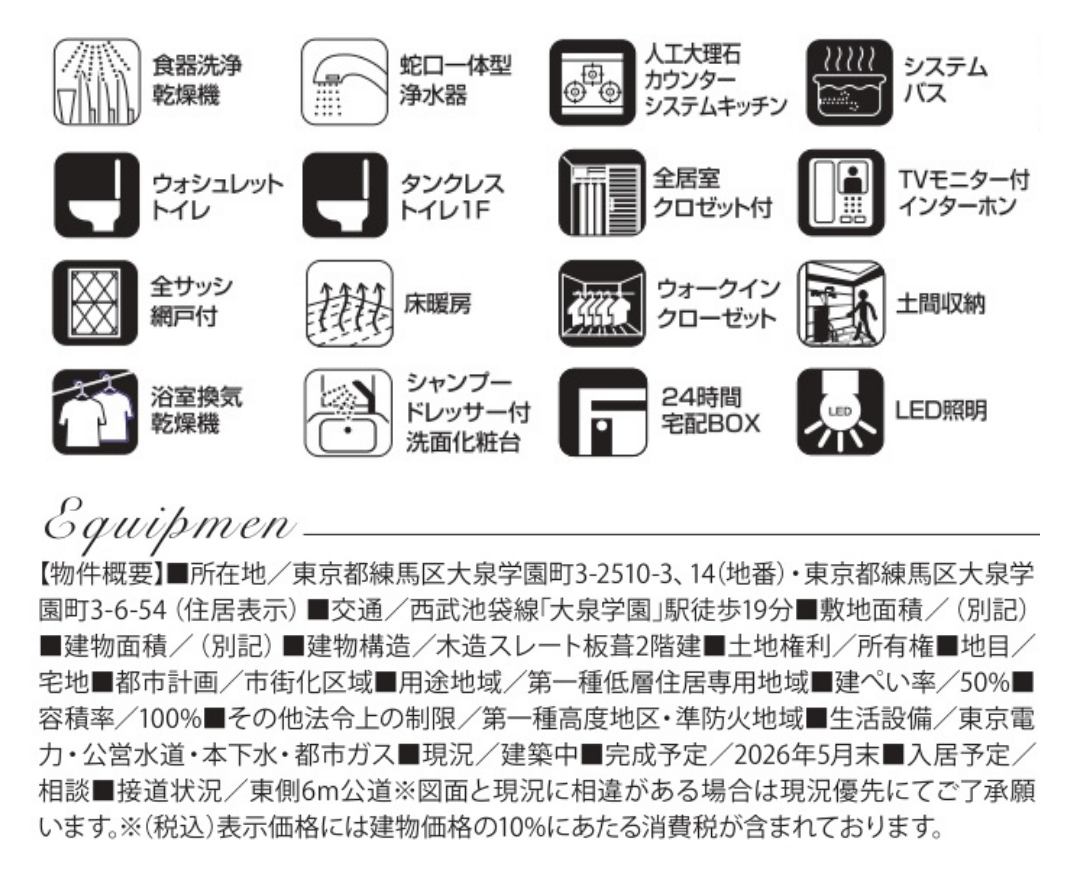 【練馬区大泉学園町3丁目 新築戸建】 西武池袋線「大泉学園」駅 徒歩19分。 落ち着いた住宅街に誕生した新築分譲住宅です。 敷地面積は約111㎡~131㎡。 建物面積は約103㎡~104㎡のゆとりある住まい。 間取りは1号棟3LDK+S、2号棟4LDK。 LDKは約19帖以上の広々空間で、床暖房付きの快適なリビング。 家族が集まる中心空間としてゆったり過ごせます。 設備面でも ・食器洗浄乾燥機 ・床暖房 ・浴室乾燥機 ・宅配BOX ・TVモニター付きインターホン ・全居室収納 など、日々の暮らしを快適にする設備が整っています。 販売価格は 【1号棟】6,780万円(税込) 【2号棟】7,280万円(税込) さらにREPUNITでは仲介手数料0円でご紹介可能。 住宅ローン相談、住み替えローン、FP相談など、資金計画から購入までトータルサポートいたします。 練馬区・大泉学園エリアで新築戸建をお探しの方は、ぜひお問い合わせください。